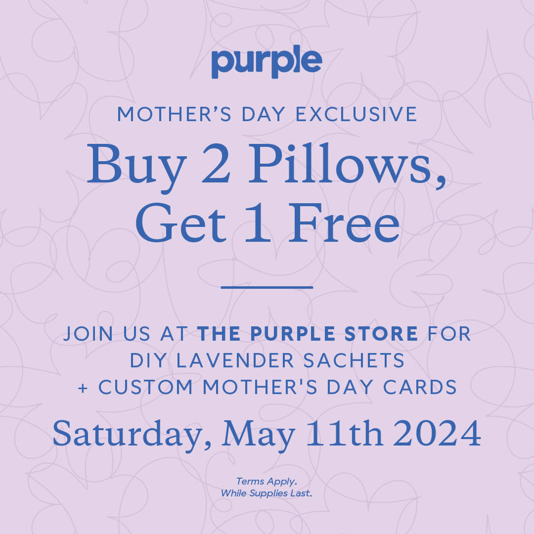 Visit Purple this Saturday, May 11th, and you get one free if you buy two pillows! Plus, enjoy DIY lavender sachets and custom Mother's Day cards.